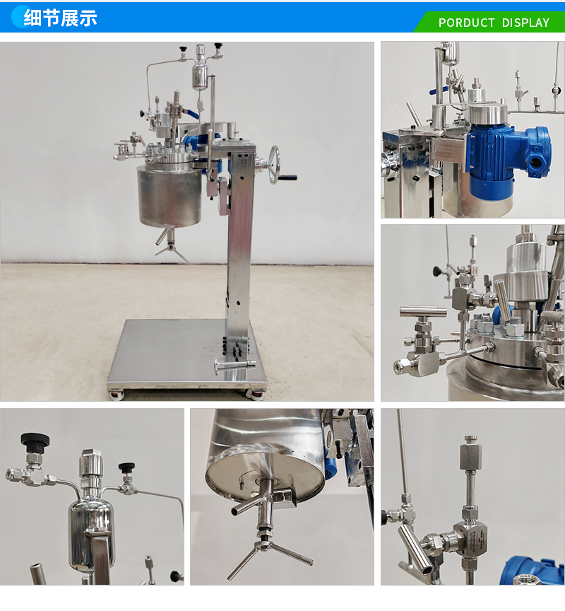 常規釜蓋開口 氣相口配針形閥,液相口配針形閥及釜內插底管,固體加料口配絲堵,測控溫口配鉑電阻,壓力表安全爆破口配壓力表及安全防爆裝置,釜內冷卻盤管進、出口配水咀